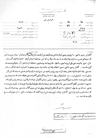 آقایان رحیم حاتمی داروفروش و نبی کرمانشاهی و عسگر عبدلی از کسبه بازار ملایر عمارتی را در خیابان خیام خریداری که سینمای مدرن بسازند و با اینکه مدت سه ماه میگذرد که این معامله انجام گرفته اما با مخالفت آقای حاج شیخ باقر محسنی یکی از روحانیون با نفوذ ملایر مواجه و به عناوین مختلف از ساختن آن جلوگیری به عمل آورده است. آقای رحیم حاتمی ضمن انتقادی که از دخالت یک معمم مینموده اظهار داشته که آقای محسنی به داخل خانواده هم رخنه کرده و پدر و زنم را علیه من شورانیده و اینها هم مدعی هستند که این کار زشتی است از طرفی من 150 هزار تومان پول دادهام و با کارشکنی آقای محسنی متوقف مانده است و چند روز قبل با فروشنده خانه به حضور آقای محسنی رفتیم در این مجلس آقایان فرماندار ملایر ـ بهمند رئیس اوقاف حضور داشتند. من گفتم آقای محسنی یا اجازه بدهید سینما ساخته شود یا پول مرا از فروشنده بگیرید و فروشنده مدعی شد که من به پول احتیاج داشتم که ملکم را فروخته و پولی ندارم سپس آقای محسنی پیشنهاد کرد که شما حمام بسازید و از طرفی آقایان فرماندار و بهمند هم هر چه گفتند که سینما محسناتی دارد مؤثر واقع نگردیده است.